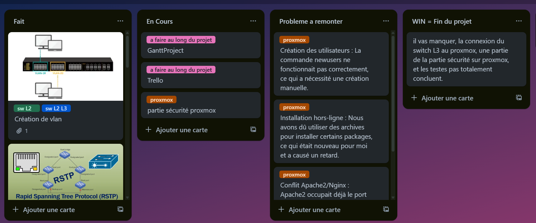 Le projet SAE12 consistait à concevoir et déployer un prototype d'infrastructure réseau pour Fibre&Company, une entreprise en forte croissance. L'objectif était de remplacer un réseau obsolète par une infrastructure sécurisée, structurée et évolutive, utilisant du matériel Cisco (commutateurs L2/L3, routeur 2911) et une virtualisation sous Proxmox avec une VM Debian. Le projet comprenait la création de VLANs, le routage inter-VLAN, la configuration de protocoles réseau avancés (RSTP, EtherChannel), ainsi que la mise en place de services internes (DNS, SMB, serveur web, TFTP) et des mesures de sécurité conformes aux recommandations ANSSI.